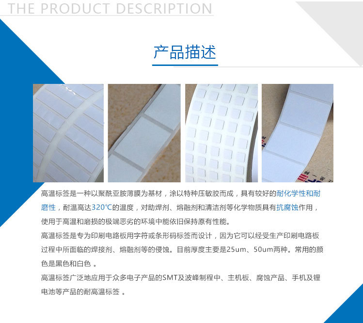 高溫標(biāo)簽聚酰亞胺薄膜為基材,涂以特種壓敏膠而成,具有較好的耐化學(xué)性和耐磨性,耐溫范圍200℃~600℃,對助焊劑、熔融劑和清潔劑等化學(xué)物質(zhì)具有抗腐蝕作用,使用于高溫和磨損的極端惡劣的環(huán)境中能保持原本性能。它是專為印刷電路板用字符或條形碼標(biāo)簽而設(shè)計(jì),因?yàn)樗梢越?jīng)受生產(chǎn)印刷電路板過程中所面臨的焊接劑、熔融劑等的侵蝕。目前厚度主要是25um、50um兩種。常用的顏色是黑色和白色 。高溫標(biāo)簽廣泛地應(yīng)用于眾多電子產(chǎn)品的SMT及波峰制程中、主機(jī)板、腐蝕產(chǎn)品、手機(jī)及鋰電池等產(chǎn)品的PCB板高溫標(biāo)簽。
